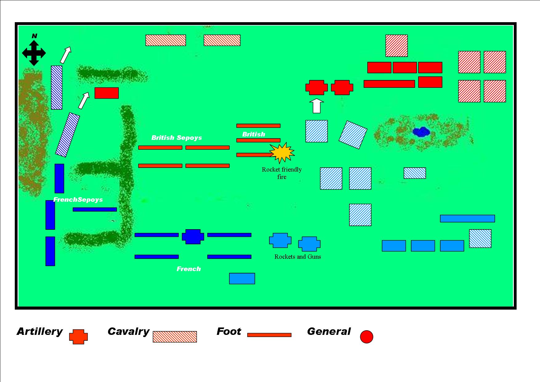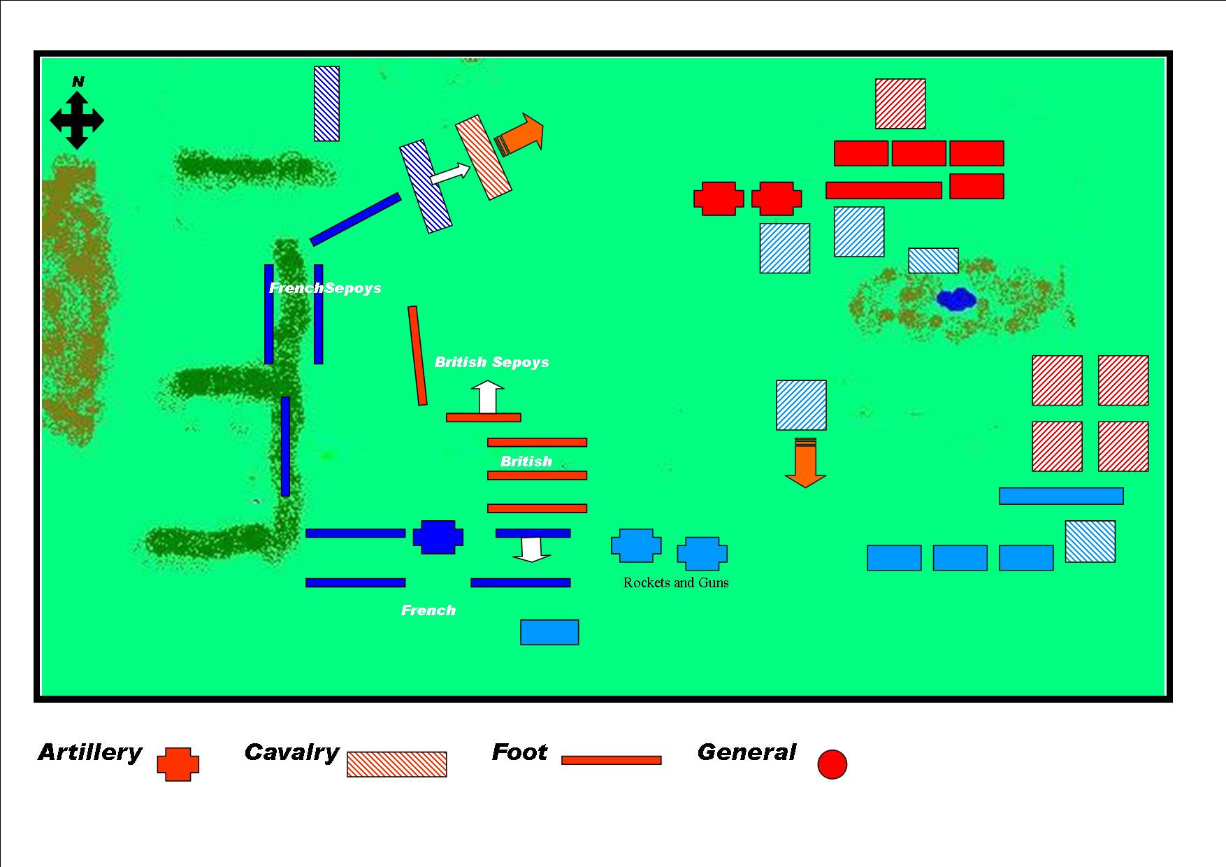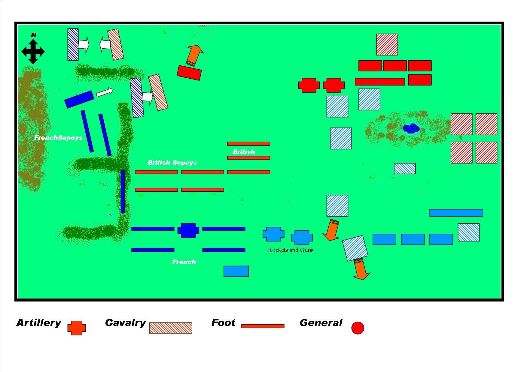 This success had come though too late in the day. The British and French Indian allies had fought each other to a standstill, neither gaining a decisive advantage but nearer to hand it was clear that the British were coming close to being surrounded by the victorious French Sepoys and the rampaging mercenary cavalry. The lightening flank attack ordered by Soubise was an outstanding success and all the British could do now was turn about and march back to their camp, hoping it was unlooted and ready to see off any pursuers with a well aimed volley. The French would press the retreat as hard as they dared but with hordes of pilfering bandits and Pindaris galloping out of the evening murk the would have to be careful not to get separated from their exhausted allies and find themselves the pursued instead of the pursuers.