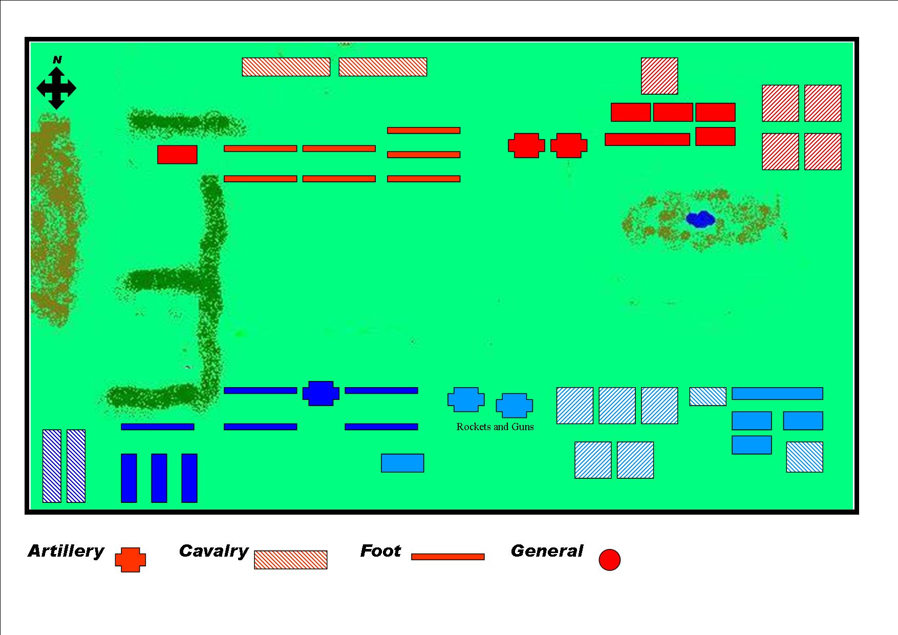 Directly across the plain Soubise could see the most dangerous of the enemy forces, the English regular line companies. The redcoats were deployed in a column of three company lines one behind the next. Next to them were the British Sepoys, (treacherous, mercenary Hindoos, ) again deployed in a column of companies. Behind these columns were mercenary horse, ready to support the infantry. To Soubise surprise the enemy did not appear to have guarded the stretch of hedged enclosures that protected the right of their lines excepting one straggling mob of il-armed native militia. From the previous day’s scouting Soubise knew that there was a narrow way between the hedges and the strip of woods beyond and that the woods were too densely overgrown to conceal an ambushing force. [an army Characterisation card had been drawn giving a stratagem of placing hidden thickets in a nominated wood]. Reacting quickly to this information, the orders were given for the mercenary lancers to race through the gap in their speedy column and get into the flank and rear of the enemy army. The French Sepoys (brave and loyal Indians trained in the French manner of war) were sent some to follow the cavalry and some to clamber through the hedges.
