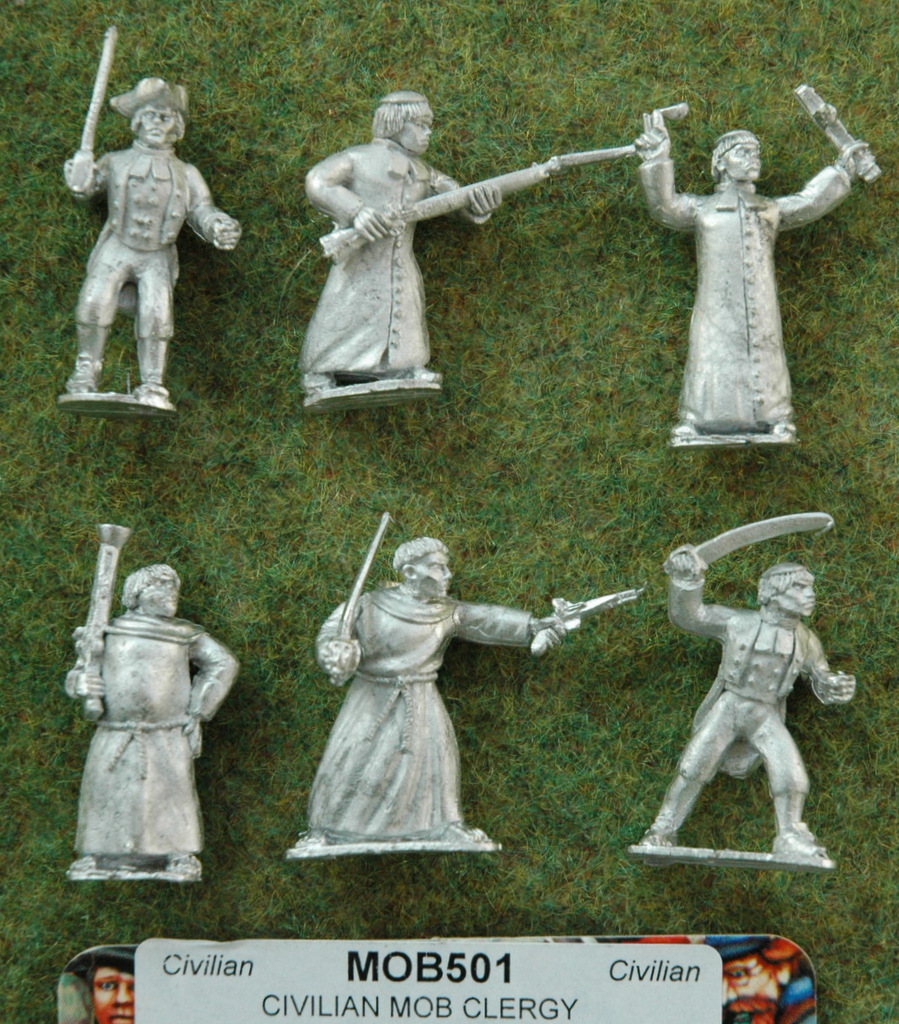One of the ranges that I had not seen before is a civilain "mobs" line. These are figures in vaguely 18th / early 19th Century garb, armed with a variety of improvised and some more purposeful weapons. There are loads (maybe 30?) packs including mounted civilians and civilian artillery. The style is relatively simple with reasonable proportions and should be easy to paint. I picked up a blister each of the armed women characters and the armed clergy, as the most unusual examples.