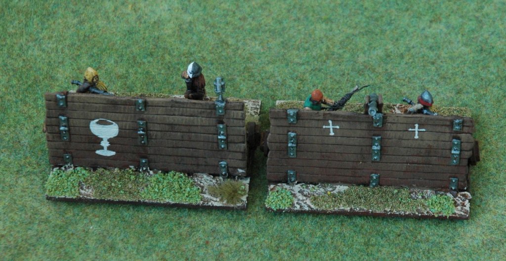 New recruits to the Hussite army in the last battle were 2 units / batteries of gun wagons. These are effectively light gun batteries in Piquet terms but have the protective properties of the war wagons that the Hussite use. A gift from Les of 4 painted and based wagons from an ebay spending frenzy, were the starting point for these units. The wagons had no guns or crew with them but the sliding doors over a firing aperture gave me the idea. As I couldn't spot suitable tiddly cannons in the usual ranges of figures I buy, I decided to make my own - how hard could it be? (I had the fall-back position that these are early ramshackle devices and manned by peasants so they didn't have to be consistent or look machine made.)
