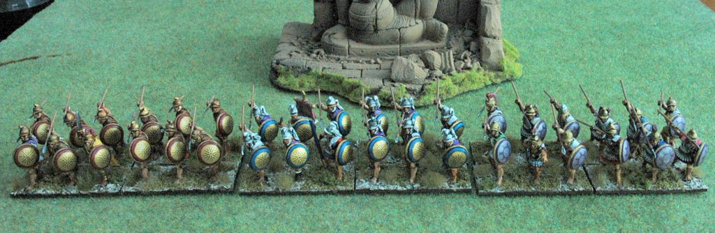 The Hypaspists were to be armed with short spears / javelins as this fitted with one of the interpretations of the account of the battle of Hydaspes that seems to suggest that the Macedonian heavy infantry used missile weapons against the Indian elephants. This also suits the Hypaspists elite status and multi-role capabilities.