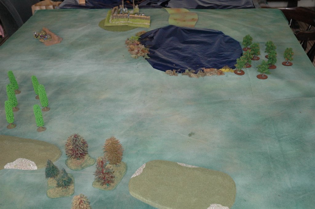 The western end of the table, trees represent thick (type 3) forest, all the rest of the table is assumed to be covered in open (type 2 ) woods.