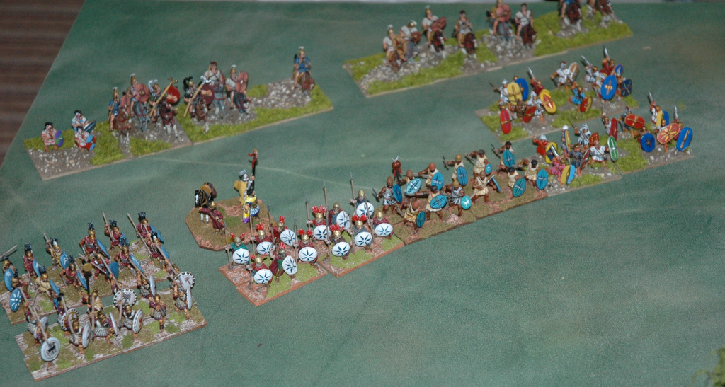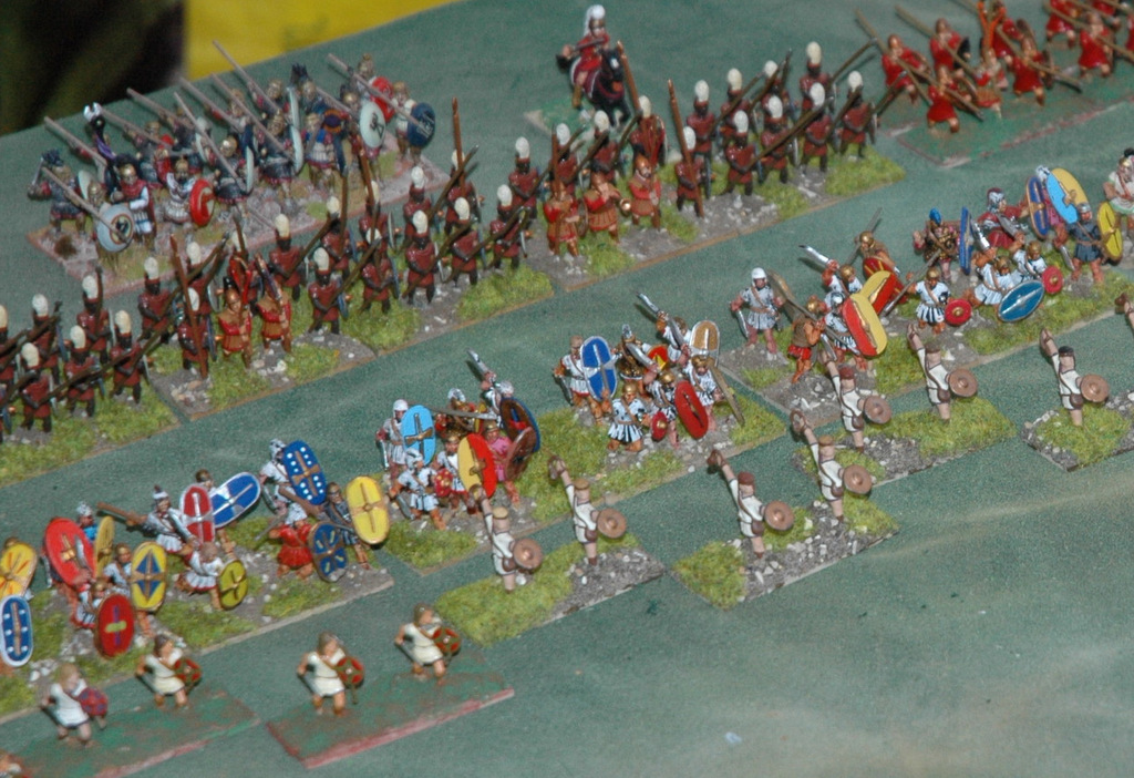 Skirmishing Balearic slingers lead Gallic mercenaries into the fight. Behind them the veteran Libyan spearmen.
