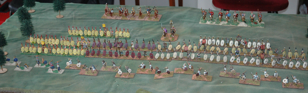 This version started before the Romans had managed to cross the river and was the first outing of our new (much wider) river. The Romans had two full legions formed up on the table and a promise of reinforcements coming in turn 4. Opposing them were 34 units of Carthaginians, comprising mainly Spanish Scutarii and close order spearmen (presumably Libyans/Liby-Phoenicians.) These were formed up in depth in the gap between the woods, facing the Legions and also as a flanking force threatening the Roman left. Thus the Romans found themselves outnumbered 2 to 1 (at least at the outset) the only bright point being that there relatively few Carthaginian cavalry to be concerned about.