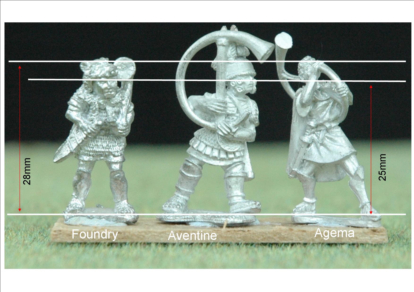 These first three musicians show off again the great detail on the Aventine figures and the terrific posing of the Agema range. The Foundry hornist (?) has the animal skin helmet cover/cloak that is to my mind more of a later style. Here the Foundry figure can be seen to be significantly shorter.
