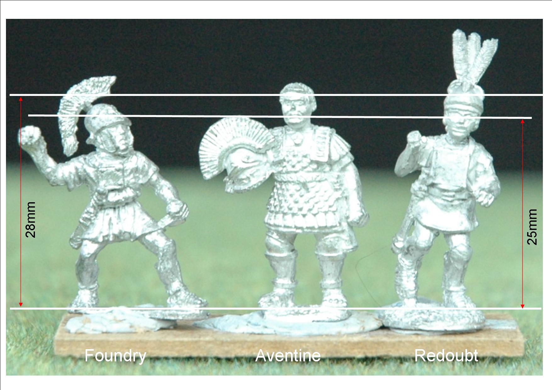 I decided it was worth showing a typical Legionary from Foundry next to the Aventine figure as the Foundry officers seem to have a bit more heft than the rank and file. The small Redoubt range look similar in size to Aventine to me, but a bit different in their proportions. Stylistically I think they are a better match for Foundry.