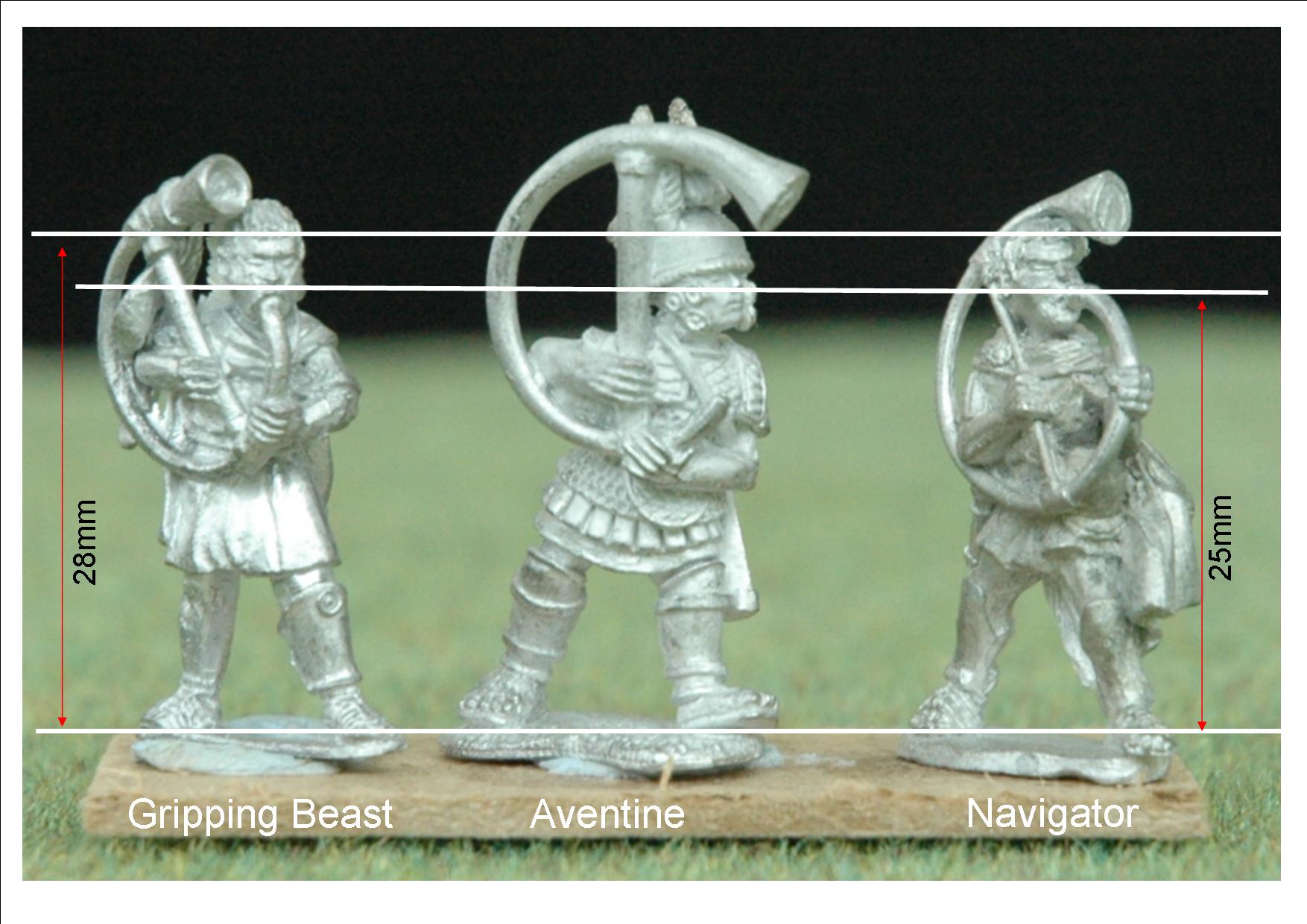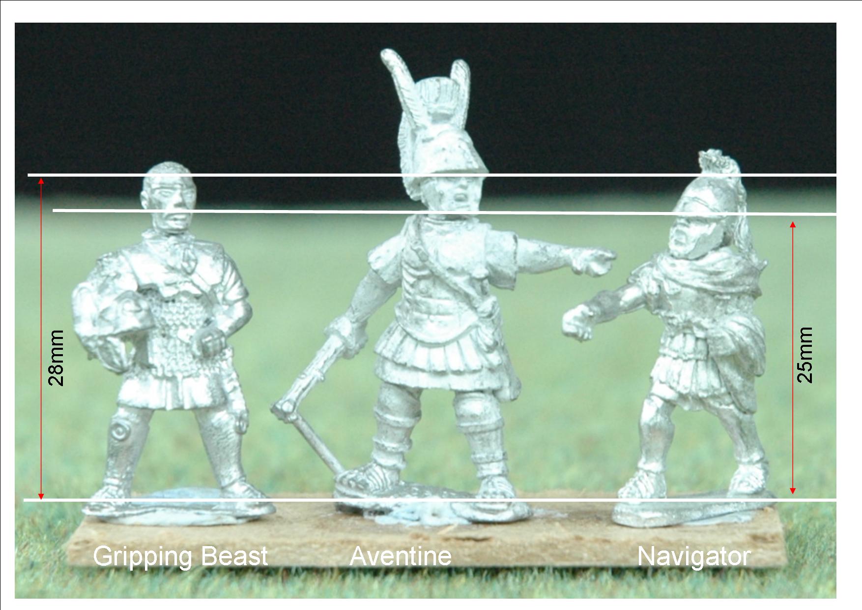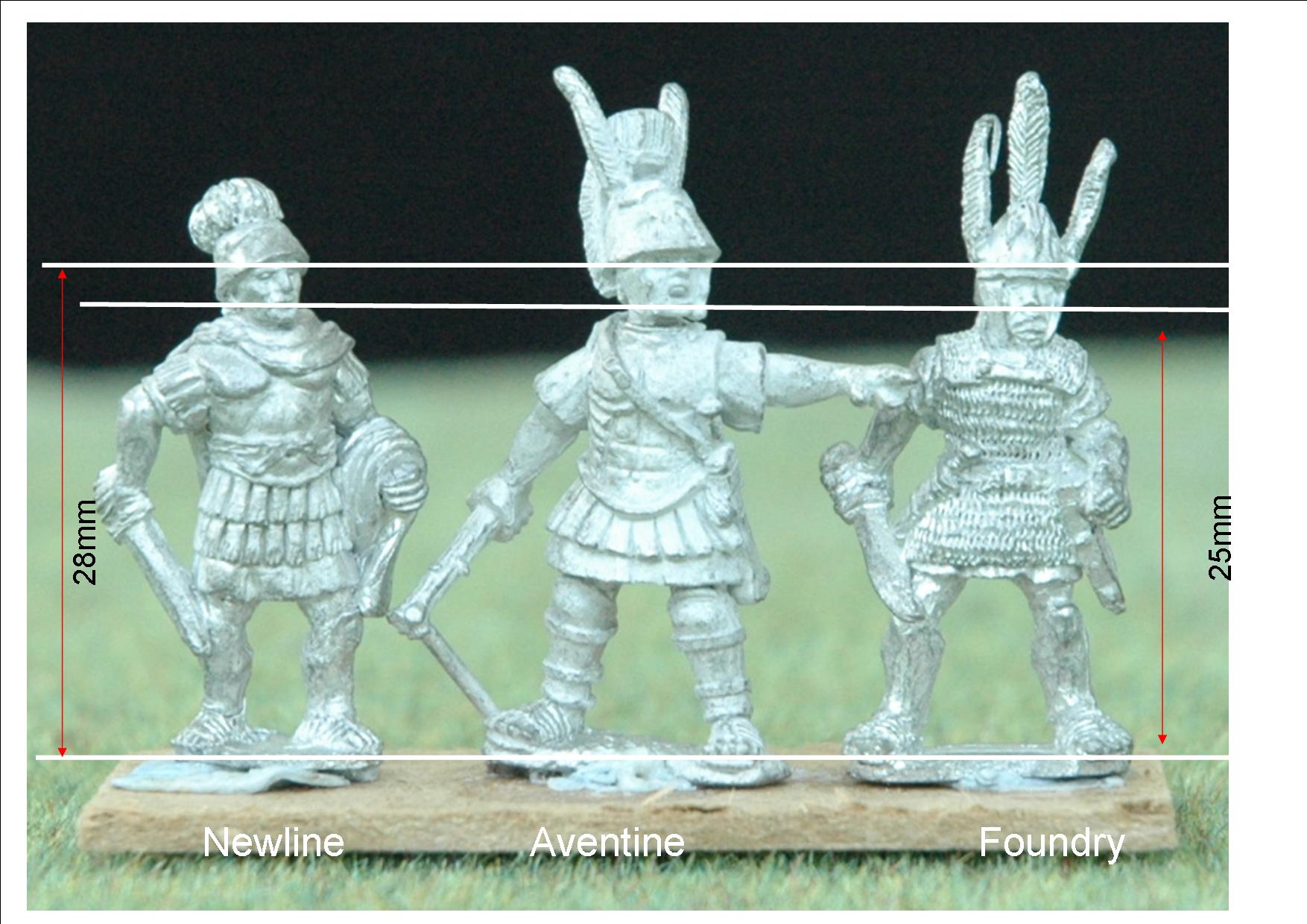Just to be confusing the Newline Roman here is from the range now sold to SHQ Miniatures, http://www.shqminiatures.co.uk Newline have subsequently produced a new Polybian Roman range which looks even better, probably around the same size but I haven't had a chance to measure one. The second Foundry officer looks like he would mix in with Aventine quite well. I am a bit surprised by that.... (I may have to do a comparison on the rank and file figures to see how those match up.)