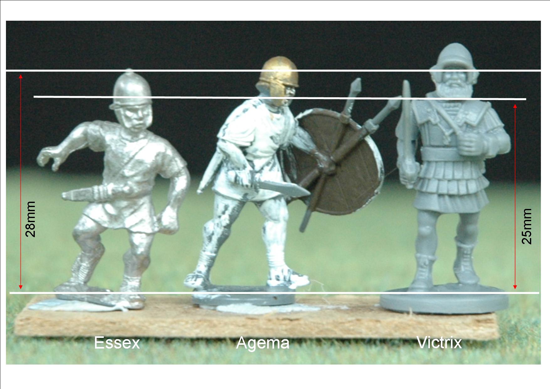First up two of the newest lines (and arguably best) Aventine and Agema. Aventine are at the chunkier end of the spectrum and have lovely detail. I only have their Etruscans but they are close in the way they are equipped to early Romans so will do for showing the size and style of this manufacturer. Agema are the first out of the blocks with Punic Wars plastic figures (as well as metals such as this one.) As usual click on the photo for a larger image.